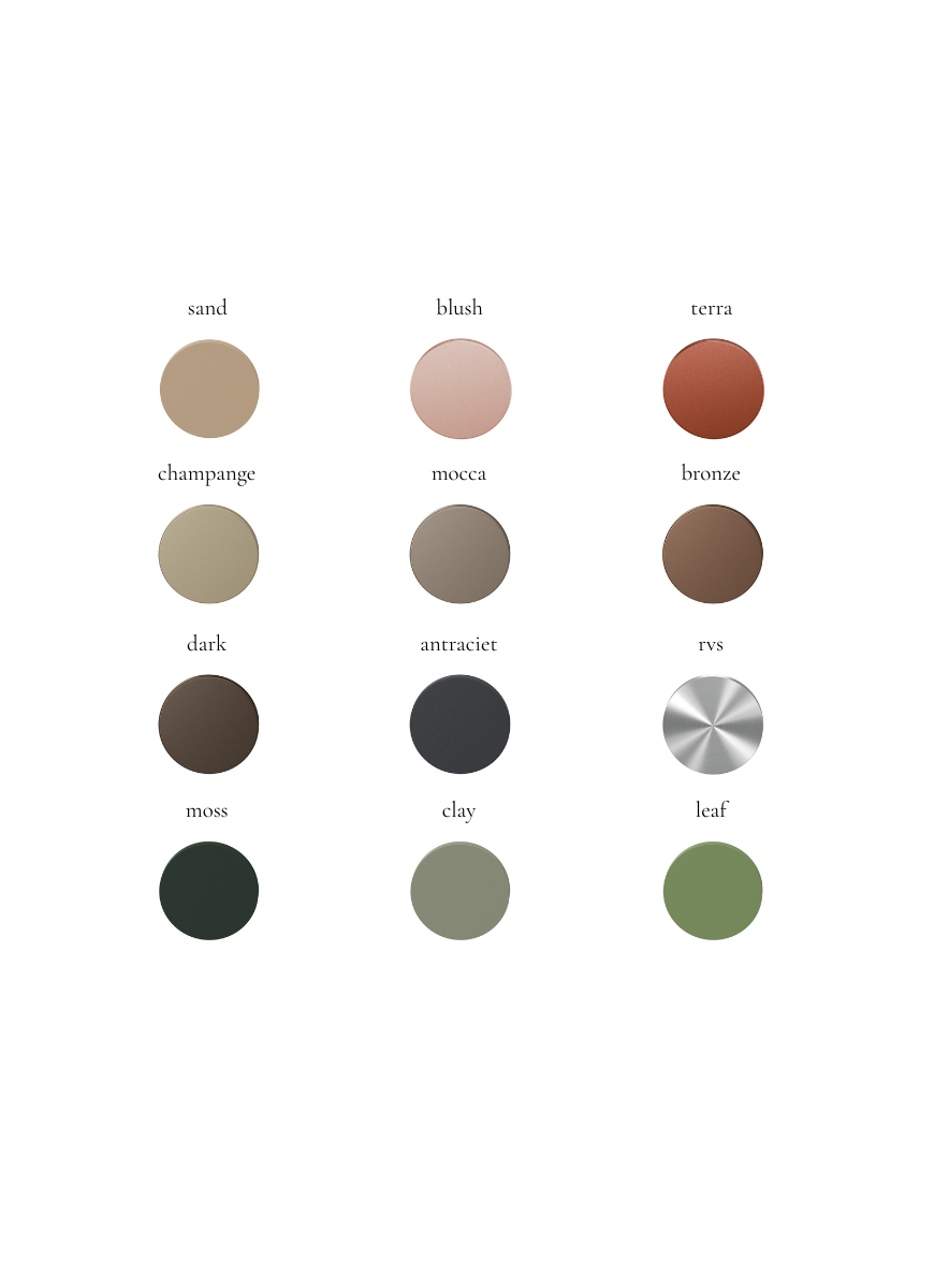 Deze deurkruk is leverbaar in 14 verschillende kleuren zoals Moss, Blush, Sand, Terra en andere kleuren.