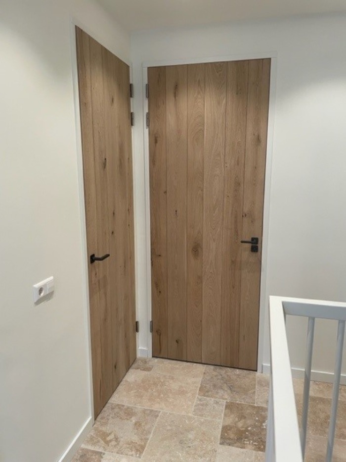 Eiken deuren, wat een prachtig stuk natuurproduct. Bij onze klant in Vijfhuizen hebben wij eiken binnendeuren en deurbeslag mogen leveren en monteren. Er is gekozen voor deuren in diverse uitvoeringen; dubbele glasdeuren, klamp- en freeslijndeuren. Eikenhout staat bekend om zijn prachtige nerfpatronen en warme, rijke kleuren. Elke deur is uniek vanwege de variatie in het hout.