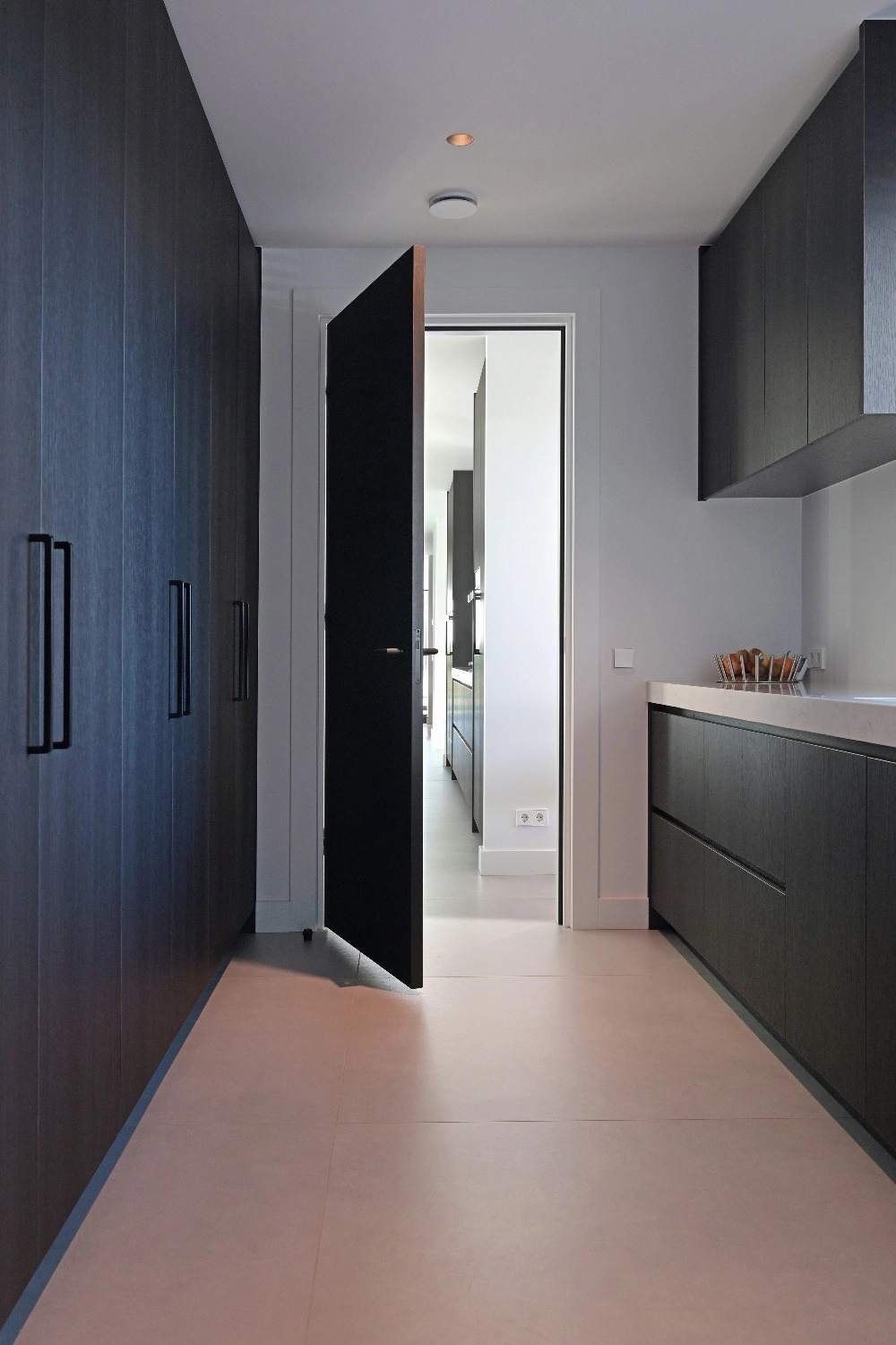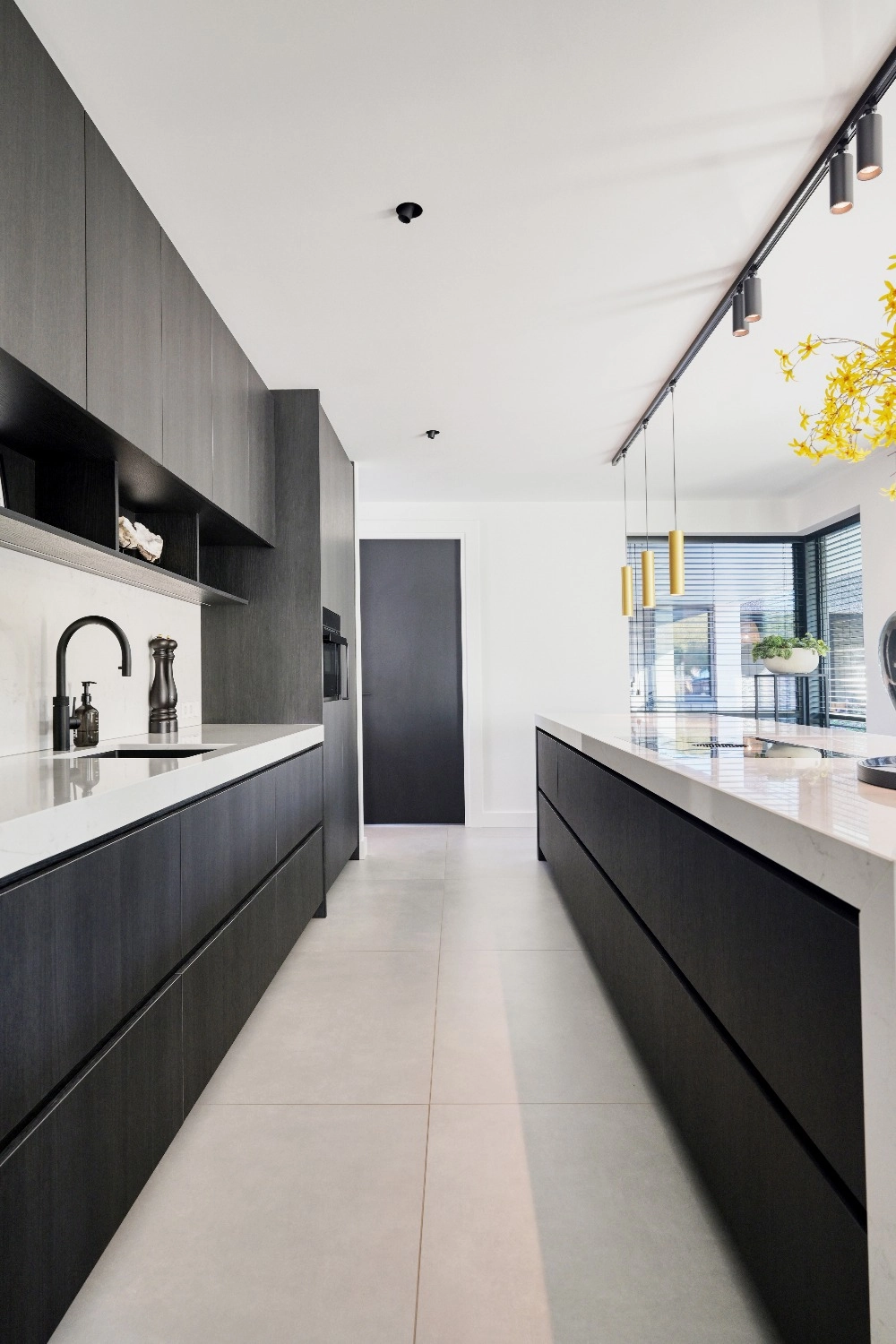 De HPL deuren zijn uitgevoerd met toplaag Deco Legno Cleaf U129 Black Oak, een donkere houtstructuur die perfect aansluit bij het moderne interieur en de keuken. De Top Soluxe Doors zorgen voor een rustige, minimalistische basis binnen de woning.