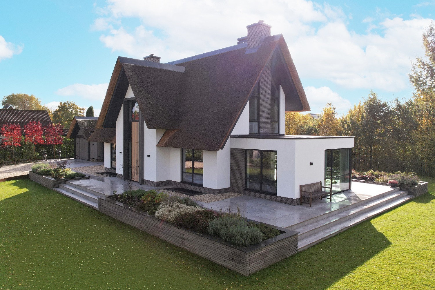 Voor deze charmante, moderne villa met rieten kap in Vleuten leverde Top Deuren diverse binnendeuren, gecombineerd met hoogwaardig zwart deurbeslag en onzichtbaar hang- en sluitwerk. De woning is gerealiseerd door Bouwbedrijf Habé uit Lunteren.